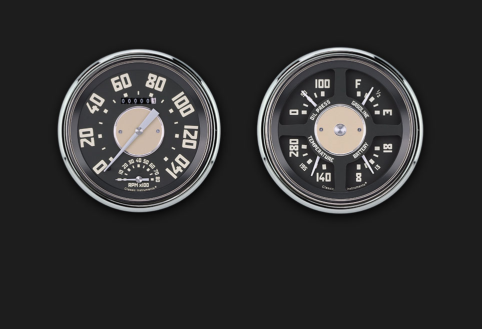 1947-53 Chevy Truck Package features an all new style designed to replicate the OE look. Billet aluminum center medallions and factory correct colors bring that retro look back into your truck while maintaining gauges that function with today's technology. It has a 4 5/8" Speedtachular (Speedo/Tach combination gauge) and Quad (Fuel, Oil, Temp, Volt combination gauge) with stainless low step bezels and flat glass lenses. This package is also available with our 4 5/8” standard speedometer in place of the Speedtachular.
