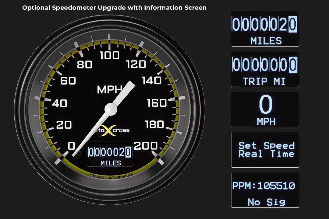 AutoCross Yellow five gauge set, with standard matte-black low step bezels and flat glass lenses. See available bezel, lens, and pointer upgrades in the appropriate drop-down menus.