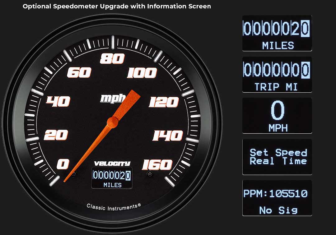 1951-52 Chevy Car Package Velocity Series Black 4 5/8" Speedometer & Quad (Fuel 0-30 OHM) with Stainless Low Step Bezel Flat Glass Lens. The package includes model specific trim rings and mounting brackets with green LED turn signals and red high beam indicator light. All necessary sending units are included.