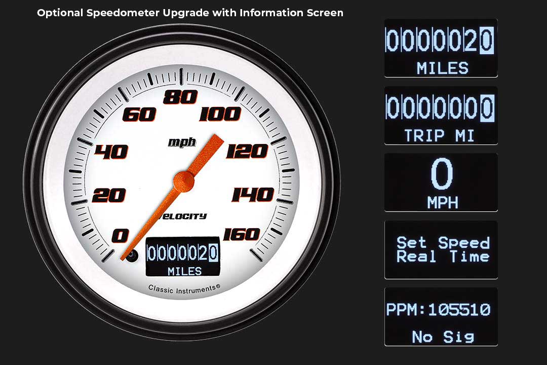 The 1964-65 Chevelle Package with our Velocity White series installed features a 160 MPH Speedometer with blue Halo high beam indicator, 10,000 RPM Tachometer, & Quad (Fuel 0-30 OHM, oil, temp, and volt gauges). It comes with complete wiring harness constructed of automotive grade TXL wire, machine-crimped terminals, tech-flex sleeving, and Molex main connectors. Also includes all necessary sending units*, mounting hardware and an adapter panel for easy installation into your existing** bezel. It is equipped with our ZST™ and works directly with ECM or VSS signals, no additional control boxes needed.