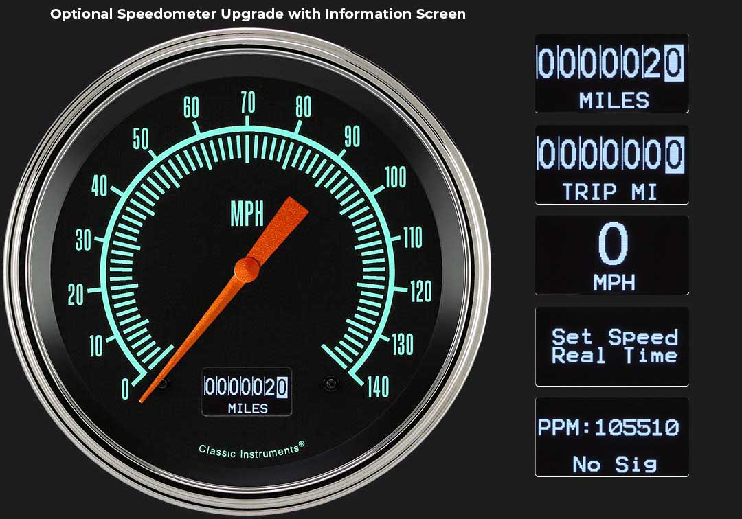 Please select curved lens when choosing a Radial bezel and select appropriate fuel ohm range if using a factory fuel sender (Ex. Ford pre-1986: 75-10 ohm, GM1964 or earlier: 0-30 ohm, GM 1965-1998: 0-90 ohm)