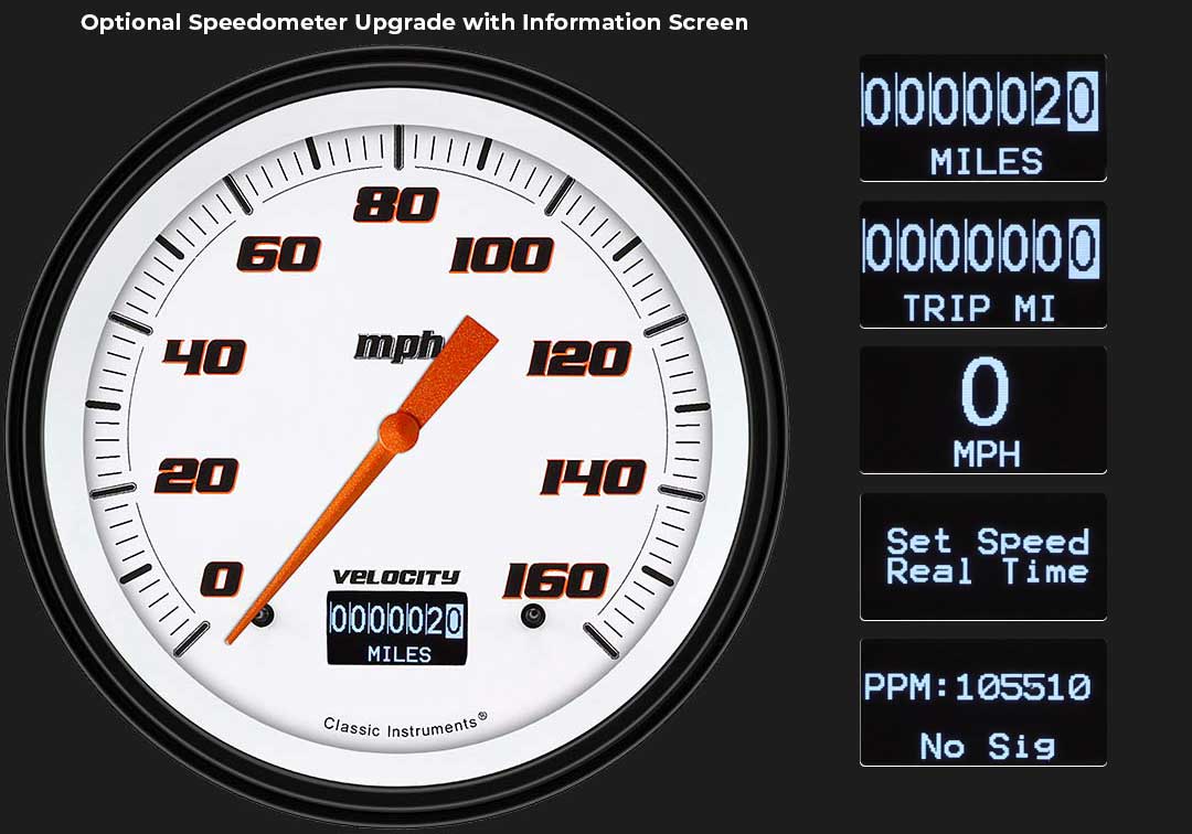 The 1967-68 Mustang Package with our Velocity White series installed, features a 4 5/8" Speedometer and tachometer, 2 1/8" Fuel (75-10 OHM), oil, and temp gauges. The cluster is completely assembled and mounted in a standard black camera case OEM style bezel. The unit is pre-wired and includes all necessary* sending units, mounting hardware, and a wiring harness constructed of automotive grade TXL wire, machine-crimped terminals, tech-flex sleeving, and Molex main connectors. Equipped with our ZST™ and works directly with ECM or VSS signal, no need for an additional control box.