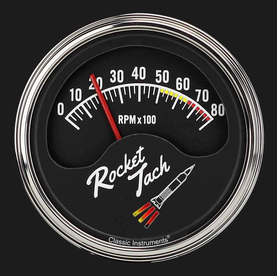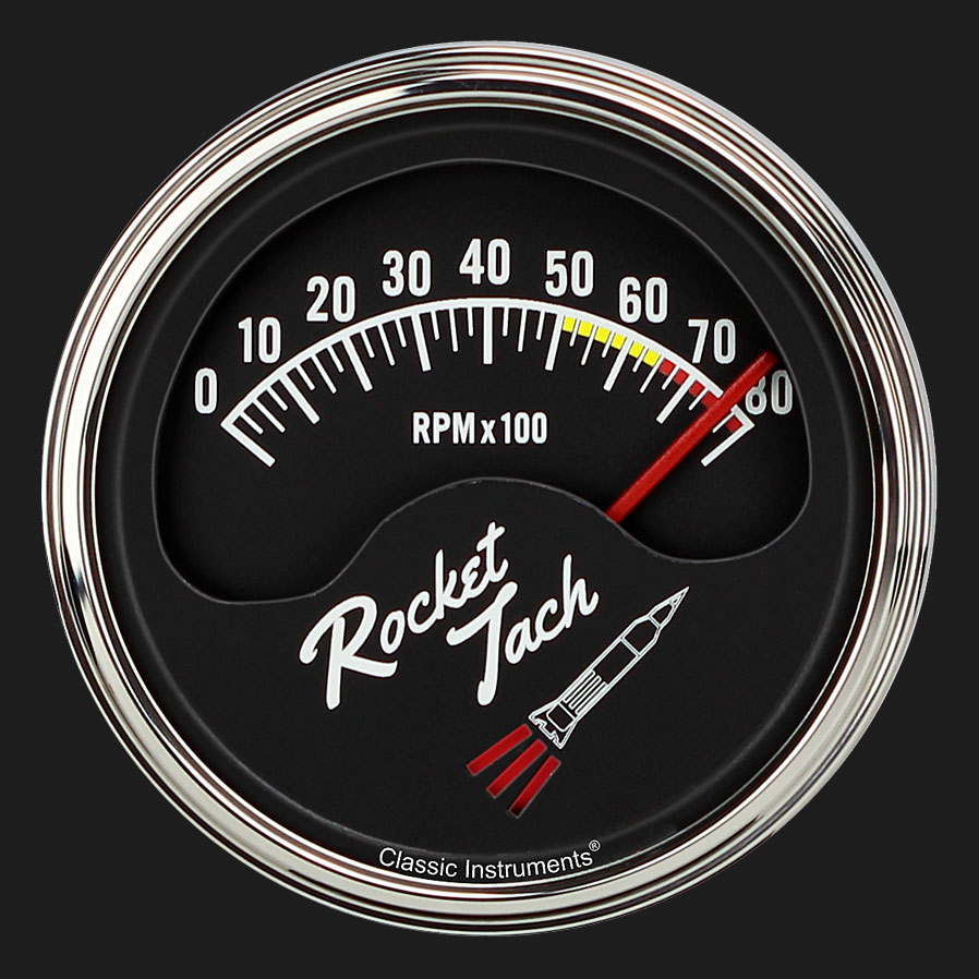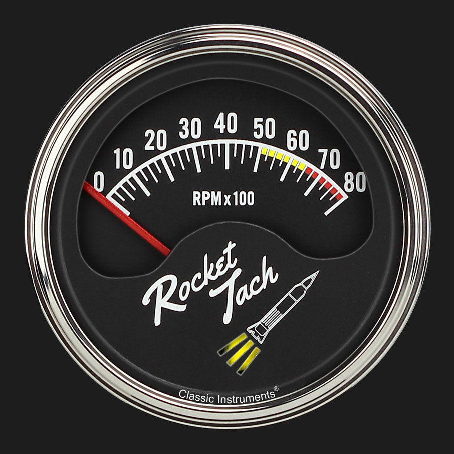 This half-sweep 3 3/8", 8,000 RPM tachometer features a dual layer design, color changing rocket booster, a red pointer, a rich black face with bright white numerals and indices, and LED lighting. Finished with a stainless low step bezel and flat glass the Rocket Tach comes installed in a chrome cup that allows for a variety of mounting positions. It is easily calibrated with pushbutton control for four, six, or eight cylinder engines and includes a single snap-in wiring harness for ease of installation. Great for completing that retro look with the latest electronic technology, the Classic Instruments Rocket Tach is truly a blast from the past. Vintage styled tube packaging included!