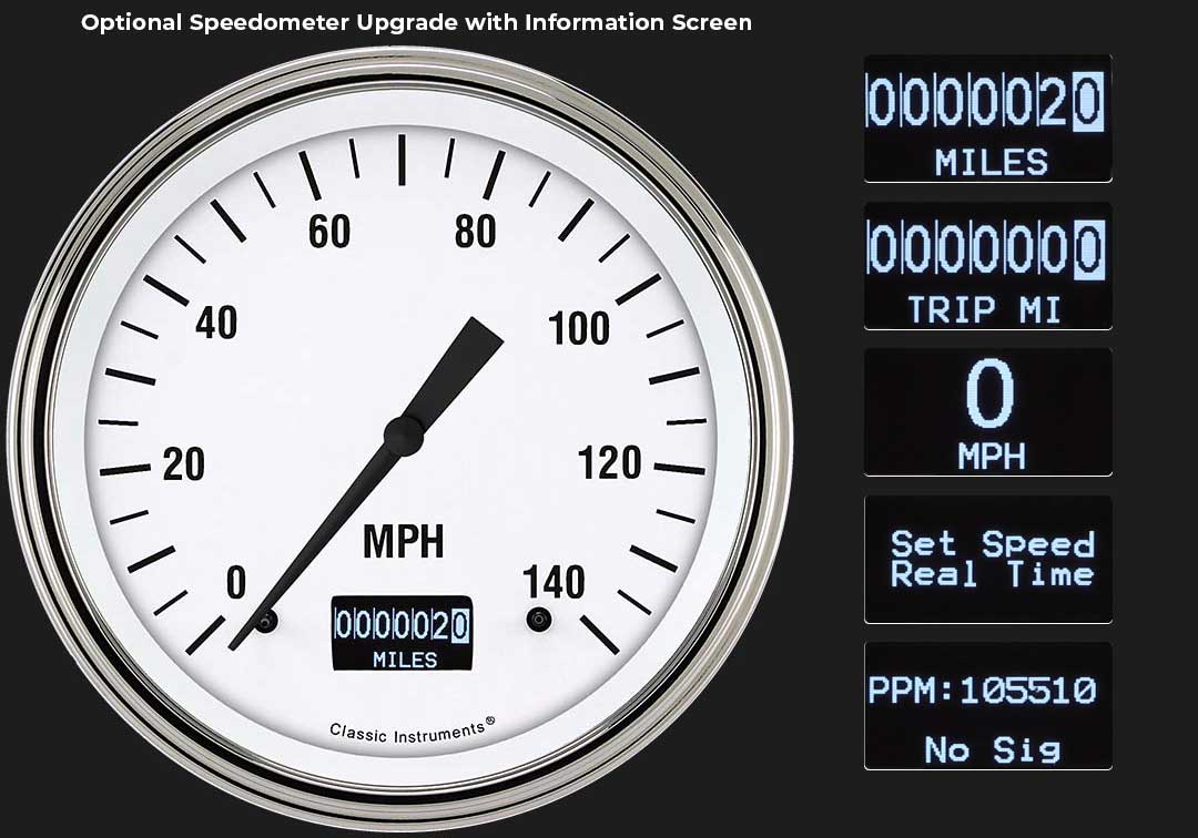 Please select curved lens when choosing a Radial bezel and select appropriate fuel ohm range if using a factory fuel sender (Ex. Ford pre-1986: 75-10 ohm, GM1964 or earlier: 0-30 ohm, GM 1965-1998: 0-90 ohm)